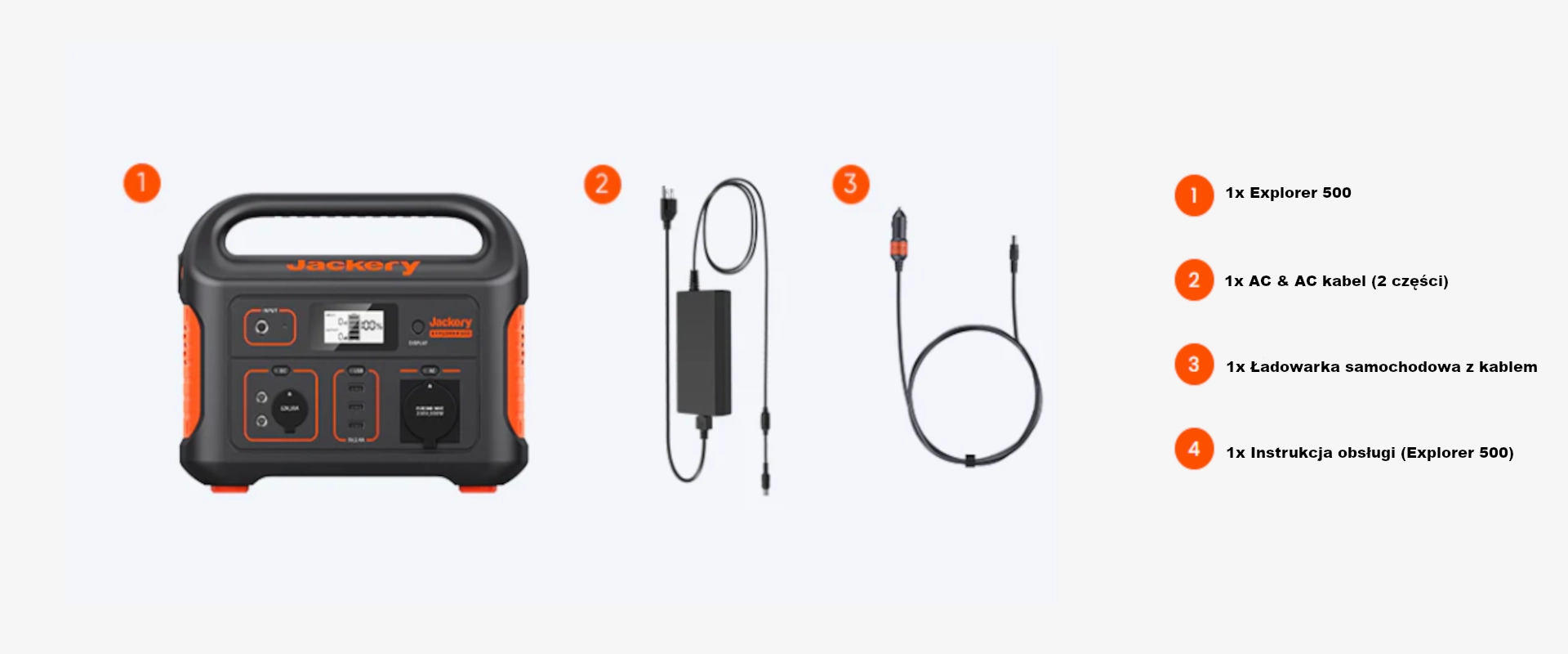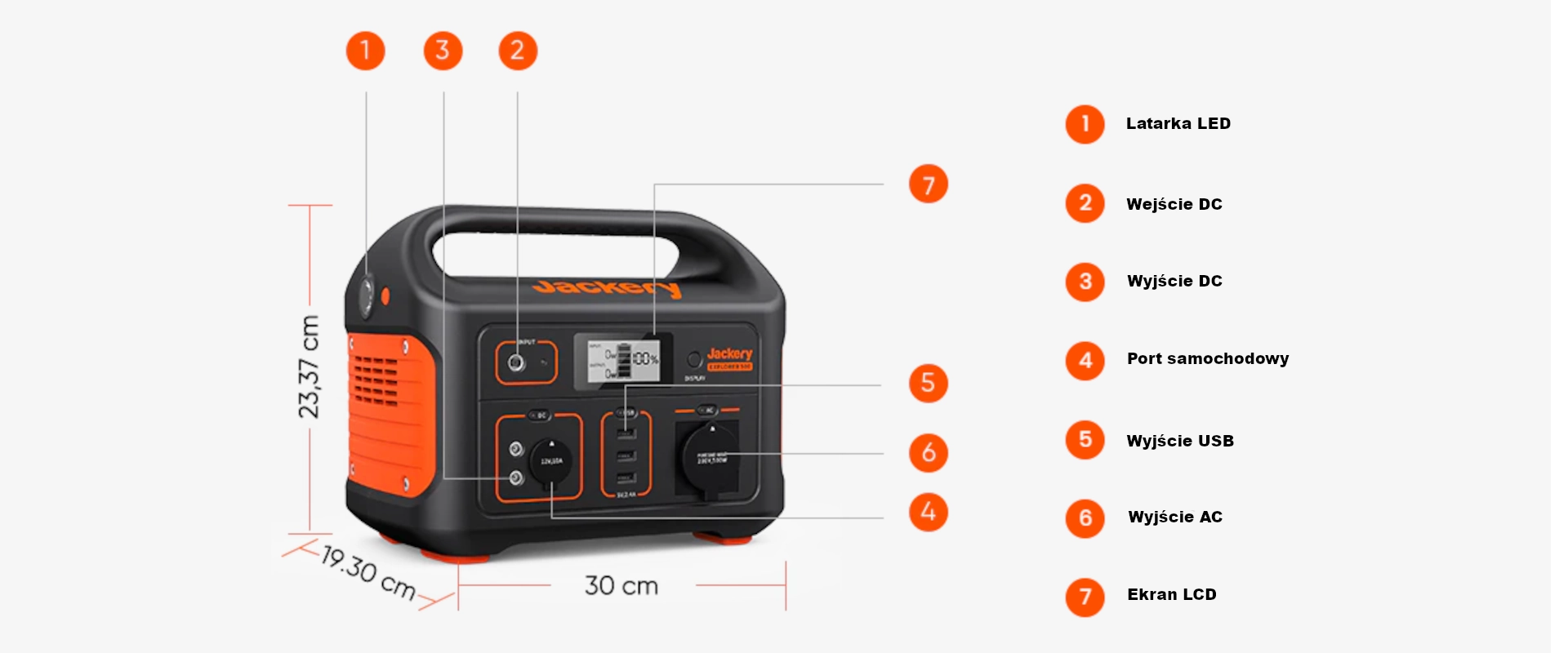 Przenośna stacja zasilania Jackery Explorer 500 posiada 1 gniazdo AC, 2 porty DC, 1 port samochodowy i 3 porty USB-A do ładowania urządzeń o niskim i wysokim poborze mocy, w tym pompy powietrza, aparaty CPAP, telewizory, mini chłodziarki i inne. Kompaktowy rozmiar i lekka konstrukcja sprawiają, że stacja zasilania jest idealna na wycieczki samochodowe i kempingi RV.